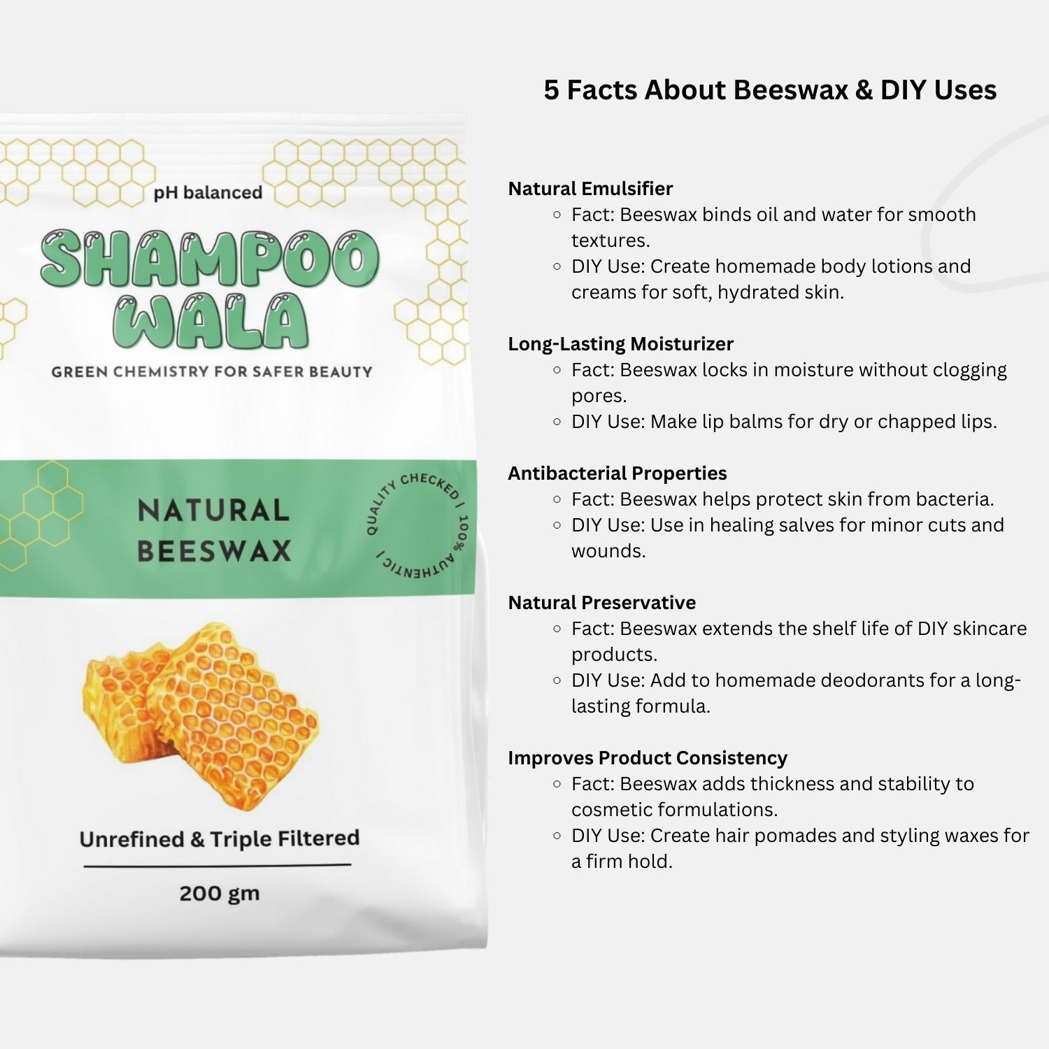 Experience the purity of nature with our Unrefined, Triple-Filtered Beeswax. Perfect for DIY skincare creations such as creams, moisturizers, body lotions, and lip balms, it locks in moisture and soothes the skin naturally. Ideal for crafting eco-friendly candles with a clean, long-lasting burn. Elevate your formulations with this versatile ingredient, prized for its natural protective and emulsifying properties.